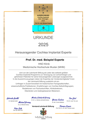 Die Auszeichnung der Lehnhardt Stiftung wird mit einem exklusiven Siegel „Herausragende(r) Cochlea Implantat Experte / Expertin“ und einer offiziellen Urkunde verliehen. Dieses Siegel steht für höchste Standards in der medizinischen Versorgung, innovative Beiträge zur Cochlea-Implantat-Technologie und ein tiefes Verantwortungsbewusstsein gegenüber den jungen Patientinnen und Patienten. Es ist ein Symbol für Vertrauen, Kompetenz und die Kraft, Leben zu verändern.