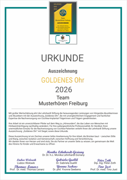 Die Lehnhardt Stiftung ist stolz darauf, Hörgeräte-Akustikerinnen und -Akustiker für ihre außergewöhnlichen Verdienste in der Nachversorgung von Cochlea-Implantat-Trägerinnen und Träger – sowohl Kinder als auch Erwachsene – mit dem Siegel der Lehnhardt Stiftung des "Goldenes Ohr" als Hörgeräteakustiker und einer Urkunde auszuzeichnen. Diese prestigeträchtige Anerkennung würdigt nicht nur technische Präzision, sondern auch die tiefgreifende Hingabe, mit der Hörgeräte-Akustikerinnen und -Akustiker das Leben von Menschen mit Hörbehinderung nachhaltig verbessern.