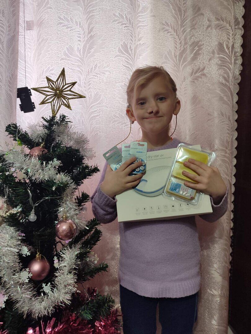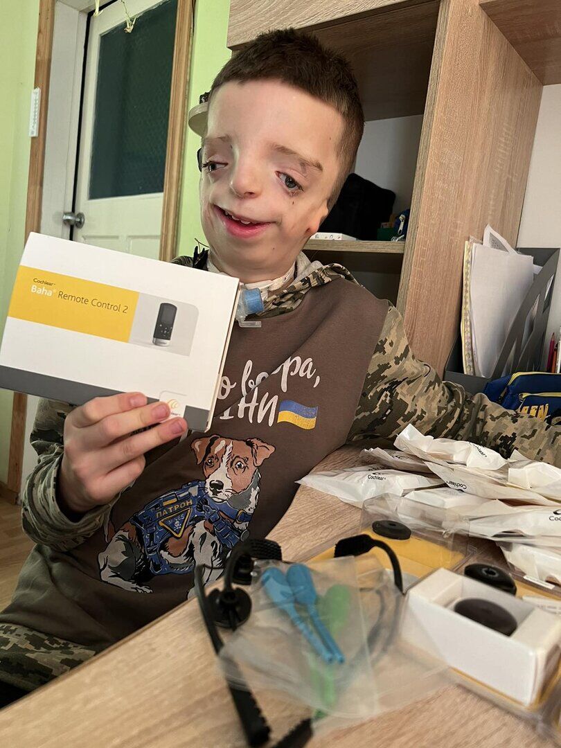 I.F. aus Kiew, 11 Jahre alt. Er trägt seit 9 Jahren Hörgeräte, geht zur Schule, führt das normale Leben eines 11-jährigen Kindes (außer dass es Krieg gibt). Das Leben mit Geräten ist in der Ukraine sogar noch schwieriger als das Leben mit CI. Im Rahmen des Landesprogramms wird nichts ausgegeben. Mama Oksana ist sehr glücklich und glaubte es erst, als sie das Paket erhielte: „Ich bin allen Beteiligten aufrichtig dankbar für den Trockner für Hörgeräte und jede Menge Batterien – das ist eine große Hilfe in einer für uns schwierigen Zeit.“